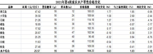 根据市农业信息中心对全市38个区县农贸市场9种主要水产品(除大带鱼、黄花鱼为冻鱼,其余品种均为活鱼)零售价格监测,第4周重庆水产总体零售均价25.57元,类价格指数为104.33。环比,4涨1跌4平稳,总体上浮0.63%、表现平稳。
