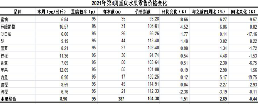 根据市农业信息中心对全市38个区县农贸市场11种大众、时令水果监测,第4周重庆水果总体零售均价8.96元,类价格指数104.38。环比,2涨1跌8平稳,总体上浮1.51%、表现平稳。