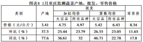 据对重庆市38个区县农贸市场蔬菜价格情况监测,1月重庆蔬菜零售价8.34元/公斤,环比、同比分别明显上涨11.65、17.80%。