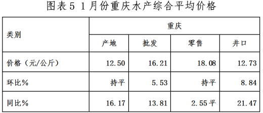 1月份井口市场大宗水产交易量为环比明显下降9.83%,同比明显增加6.29%。井口总体批发均价12.73元/公斤,环比明显上涨8.34%,同比陡升21.47%。