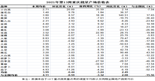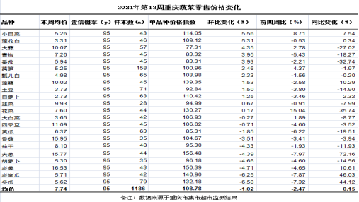 第13周(2021.03.29~2021.04.04)重庆市22个主要地产蔬菜监测品种均价3.99元(公斤价,以下无特别说明同),环比下滑0.44%、表现平稳,与前四周比略跌3.24%,同比略涨2.49%,21个共有品种明显低于全国15.56%。环比,8涨9跌5平稳。其中,上涨幅度较大的品种及价格变化:小白菜2.71元,环比大幅上涨20.00%。下跌幅度较大的品种及价格变化:茄子4.93元,环比分别明显下跌11.26%。其余品种涨跌幅均在10.00%以内。