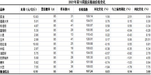 根据市农业信息中心对我市38个区县农贸市场12个主要粮油品种价格监测,第13周重庆粮油总体均价6.10元,类价格指数为107.24。环比, 1涨1跌10平稳,总体上浮0.03%、表现持平。