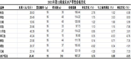 根据市农业信息中心对全市38个区县农贸市场9种主要水产品(除大带鱼、黄花鱼为冻鱼,其余品种均为活鱼)零售价格监测,第13周重庆水产总体零售均价26.40元,类价格指数为107.37。环比,4涨1跌4平稳,总体上浮0.76%,表现平稳。
