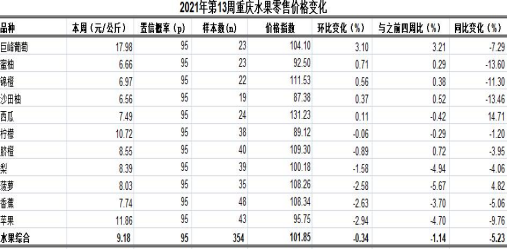 根据市农业信息中心对全市38个区县农贸市场11种大众、时令水果监测,第13周重庆水果总体零售均价9.18元,类价格指数101.85。环比,3跌1涨7平稳,总体下滑0.34%,表现平稳。