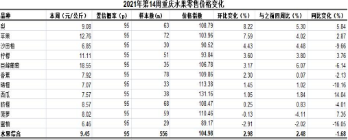 根据市农业信息中心对全市38个区县农贸市场11种大众、时令水果监测,第14周重庆水果总体零售均价9.45元,类价格指数104.98。环比,6涨1跌4平稳,总体略涨2.98%;同比,下滑1.68%,表现平稳。