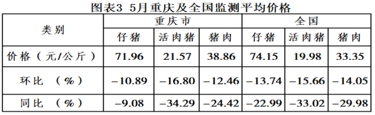 5月我市待宰活肉猪及猪肉价格与全国走势相同,环比跌。待宰活肉猪价格环比大幅下跌16.80%,同比骤降34.29%;猪肉价格环比大幅下跌12.46%、同比骤降24.42%(见图表3)。活肉猪及猪肉价格下跌的因素:一是全国生猪上市增加。据农业农村部监测,4月全国规模屠宰企业屠宰生猪1804.53万头,环比大幅增加19.6%,同比陡增41.2%。二是市内生猪产能恢复显著,消费需求不足。据国家统计局数据,一季度,重庆市生猪存栏1122 万头,同比陡增 23.8%,生猪出栏534万头,同比陡增35.2%,猪肉产量41万吨,同比陡增 36.9%,猪肉消费市场受“五一”节假日带动有限,出现阶段性供应过剩,猪价持续大幅下跌;三是进口量大幅增加。据海关总署监测,1-4月累计,进口猪肉及猪杂碎同比大幅增加 18.1%;进口猪杂同比稳中略增1.4%;其中重庆进口猪肉及杂碎同比陡增254.3%。加之部分屠宰企业将储备冻猪肉持续投放市场,鲜肉市场无利好消息,猪价持续下跌。