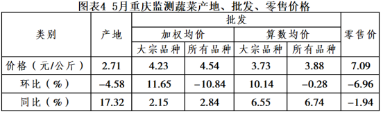 据对重庆市38个区县农贸市场蔬菜价格情况监测,5月重庆蔬菜零售价7.09元/公斤,环比下跌6.96%,同比下滑1.94%、表现平稳。
