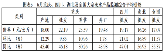 5月份重点监测品种平均价格18.00元/公斤,环比大幅上涨12.29%,同比陡升45.40%。其中草鱼20.86元/公斤、鲫鱼20.35元/公斤、白鲢9.90元/公斤、花鲢20.9元/公斤。
