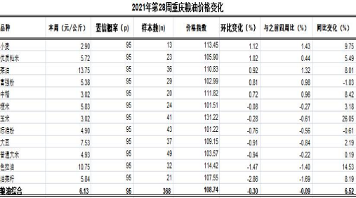 根据市农业信息中心对我市30个区县农贸市场12个主要粮油品种价格监测,第28周重庆粮油总体均价6.13元,类价格指数为108.74。环比,2涨2跌8平稳,总体下滑0.30%、表现平稳;同比,9涨1跌2平稳,总体明显上涨6.52%。