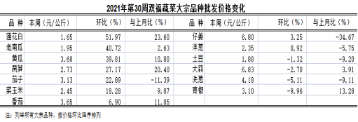 第30周蔬菜批发价格环比表现25涨9跌8平稳,总体算术批发均价4.01元(为公斤价,以下同),环比小幅上涨4.01%;同比明显下跌15.40%。总体加权批发均价3.59元,环比上涨7.33%;同比下跌8.28%。具体表现,环比涨幅较大的品种及价格变化:莲花白1.65元、老南瓜1.95元、黄瓜3.68元,环比分别升51.97%、40.72%、39.81%,均表现陡升;莴笋2.73元、茄子3.13元、花菜2.58元,环比分别涨27.17%、22.89%、21.79%,均表现大幅上涨;冬瓜、菜玉米、红苕、芹菜、藤菜、小白菜环比分别涨18.55%、18.28%、17.69%、17.24%、13.87%、10.31%,均表现明显上涨。环比跌幅较大的品种及价格变化:芋儿3.35元,环比跌21.31%,表现大幅下跌。与6月比:22跌17涨3平稳,算术均价小幅下跌4.02%;加权均价略跌3.66%。仔姜降34.67%,表现骤降;莲藕、黄秧白、胡萝卜、苕尖分别跌27.13%、24.37%、23.28%、20.80%,均表现大幅下跌;藤菜、大葱、花菜、芋儿、茄子分别跌19.13%、17.00%、15.85%、11.53%、11.39%,均表现明显下跌。芹菜、莲花白、莴笋分别涨29.28%、23.60%、20.40%,均表现明显上涨;小白菜、香菇、菜心、青椒、平菇、番茄、黄瓜分别涨17.90%、16.91%、15.86%、13.28%、13.24%、11.05%、10.80%,均表现明显上涨。其余品种涨跌幅均在10.00%(部分品种见下表)。