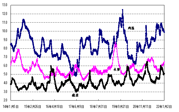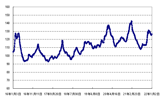 据农业农村部监测,2021年第52周(2021年12月27日—2022年1月2日,下同)“农产品批发价格200指数”为126.27(以2015年为100),比前一周升0.85个点;“‘菜篮子’产品批发价格200指数”为128.69(以2015年为100),比前一周升1.00个点。