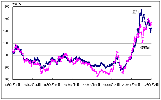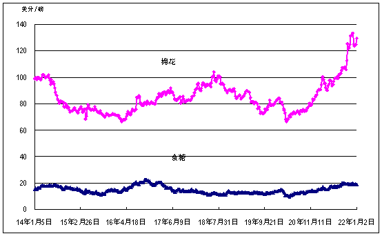 国际棉花指数(SM级)每磅129.61美分(每吨2857美元),环比涨4%,同比高50%;美国芝加哥商品交易所豆油和大豆最近期货合约收盘周均价每吨分别为1244美元和495美元,环比分别涨4%和2%,同比分别高38%和8%;马来西亚棕榈油荷兰鹿特丹港到岸周均价每吨1340美元,环比涨3%,同比高35%;国际糖料理事会原糖周均价每磅18.82美分(每吨411美元),环比涨1%,同比高34%。