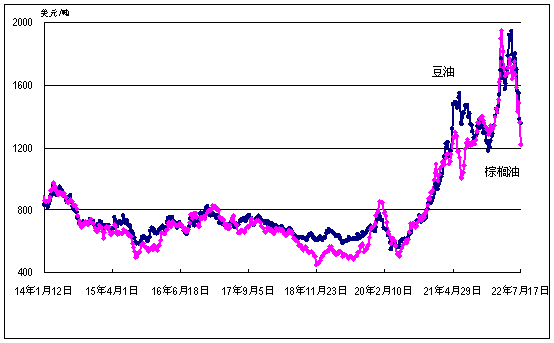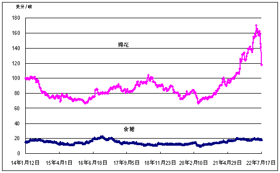 国际棉花指数(SM级)每磅117.83美分(每吨2598美元),环比跌17%,同比高19%;马来西亚棕榈油荷兰鹿特丹港到岸周均价每吨1219美元,环比跌11%,同比高2%;美国芝加哥商品交易所玉米、小麦、豆油和大豆最近期货合约收盘周均价每吨分别为280美元、296美元、1356美元和580美元,环比分别跌6%、2%、2%和1%,同比分别高13%、高23%、低8%和高9%;泰国100%B级和5%破碎率大米曼谷离岸周均价每吨分别为436美元和422美元,环比均跌1%,同比均低1%。