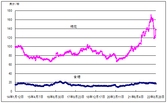 国际棉花指数(SM级)每磅137.44美分(每吨3030美元),环比基本持平,同比高29%。