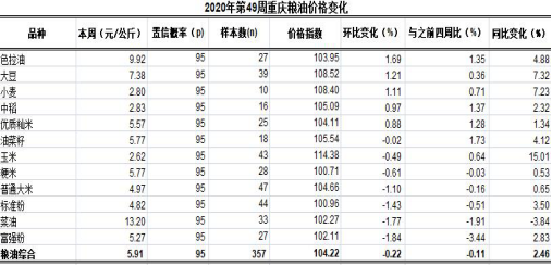 根据市农业信息中心对全市38个区县农贸市场12个主要粮油品种价格监测,第49周重庆粮油总体均价5.91元,类价格指数为104.22。环比,4跌3涨5平稳,总体下滑0.22%、表现平稳。