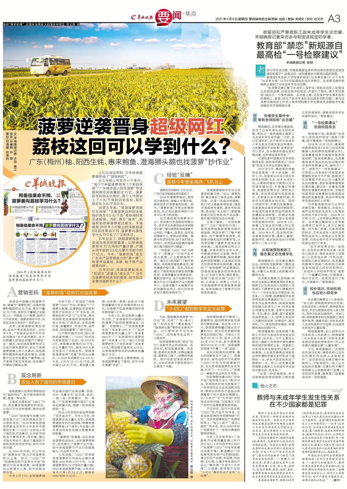 回望2019年,徐闻菠萝也因“滞销烂在田里”“主要菠萝品种田头收购价跌至0.25元/斤”等新闻时常见诸报端,后来却逆袭成为农民的致富果。2021年4月8日,羊城晚报报道《菠萝逆袭晋身超级网红 荔枝这回可以学到什么?》喊话其他农产品“抄作业”,得到广东省农业农村厅的“热回应”,向全省印发了《关于进一步做好2021广东荔枝“12221”市场体系建设工作的通知》,“官方回应”了报道提出的问题。同时将羊城晚报该篇报道作为参阅资料,印发给全省相关部门。